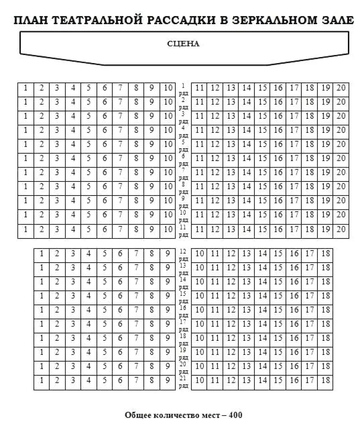 Концертный зал вмещает 400 человек (21 ряд). Подъема в Зеркальном зале нет, задние ряды находятся на одном уровне с передними, поэтому оттуда артистов на сцене будет плохо видно.