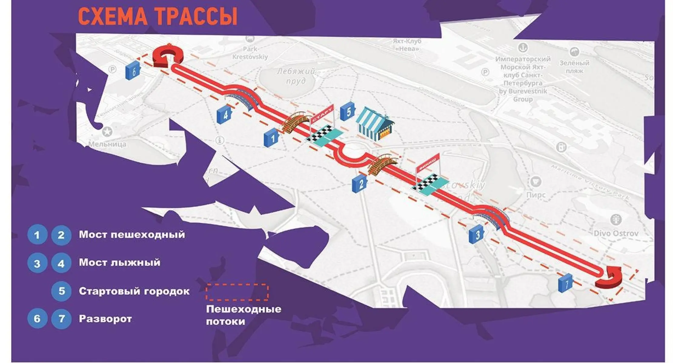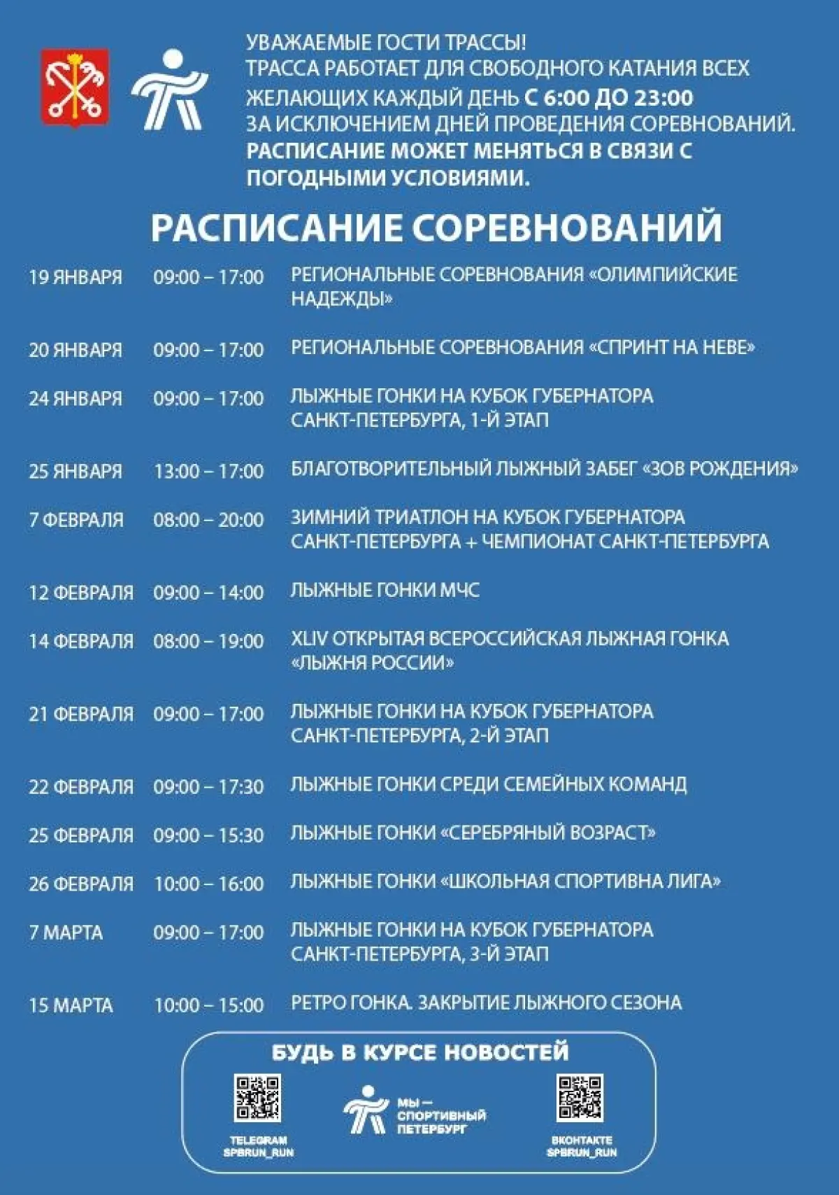 Уточнить, когда трасса открыта для свободного катания можно в соцсетях проекта "Мы - спортивный Петербург" (https://vk.com/spbrun_run, телеграм spbrun_run).