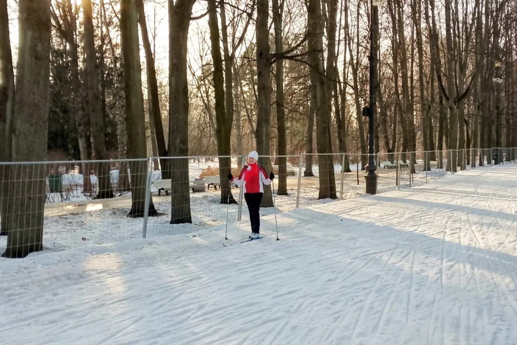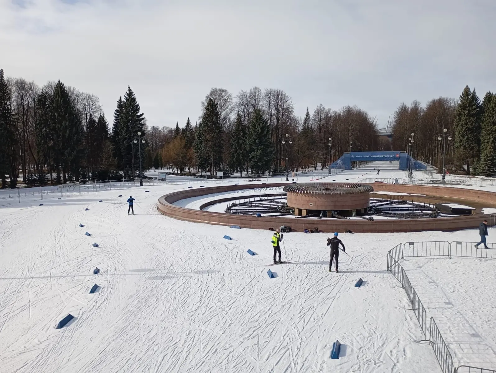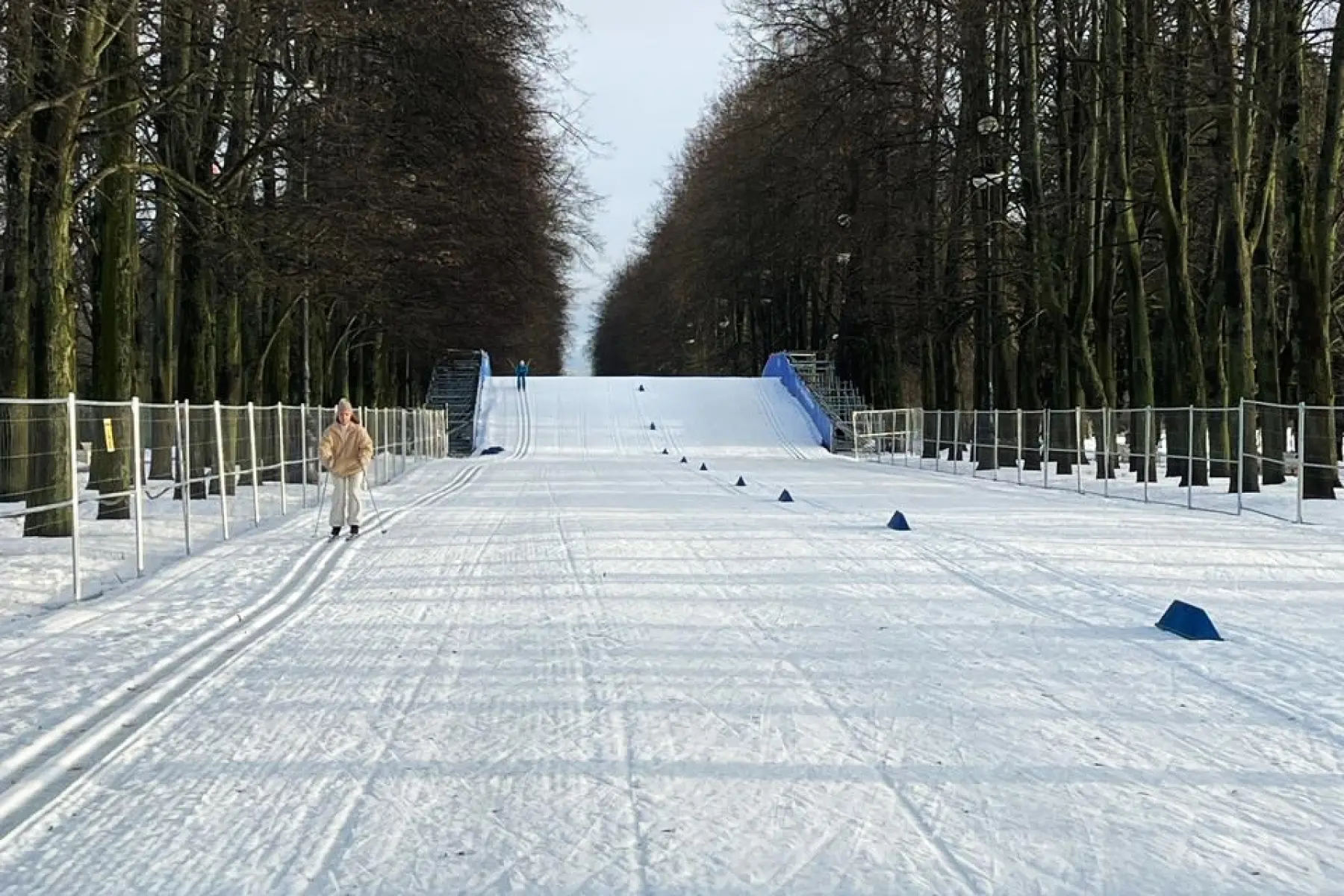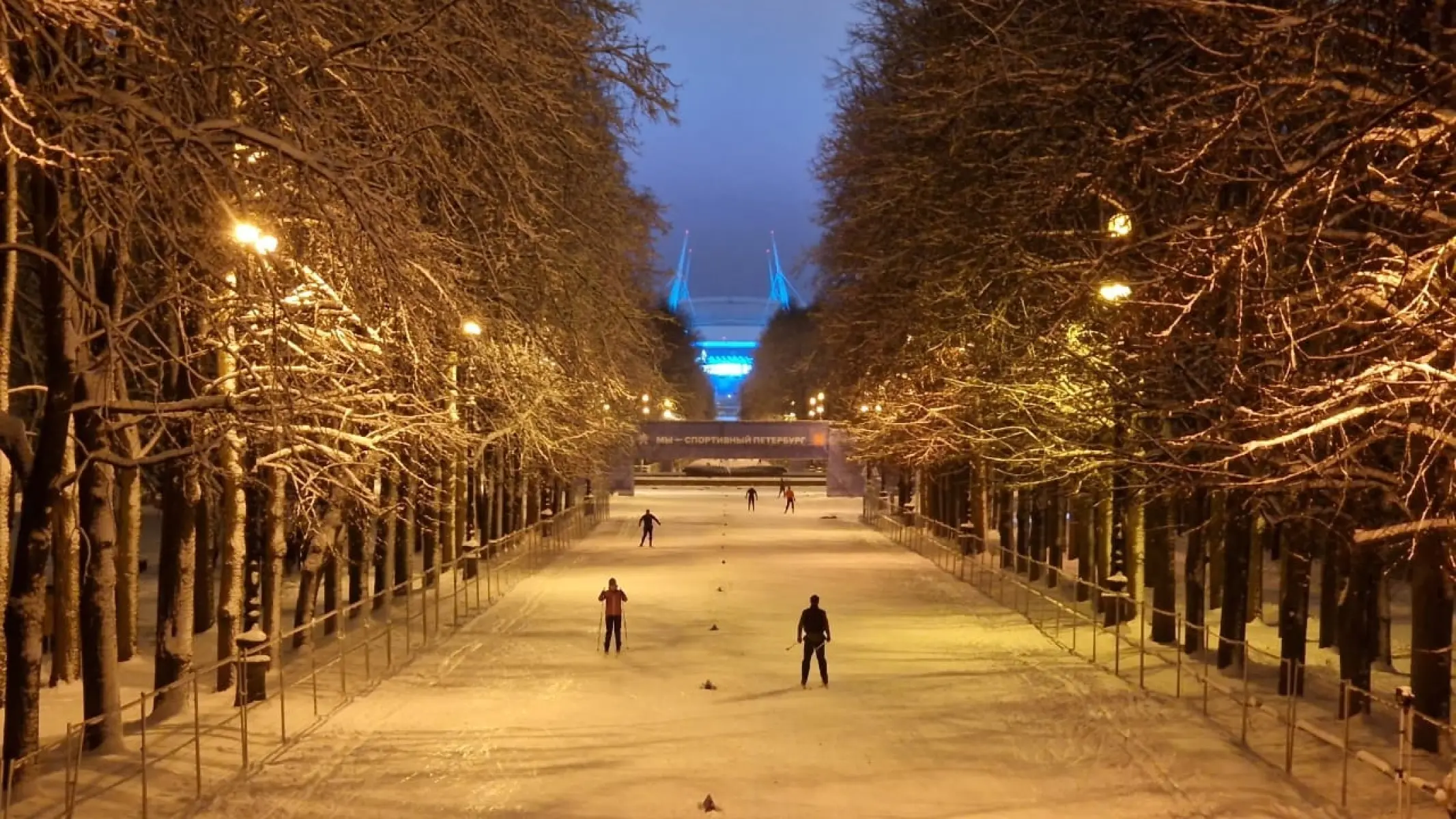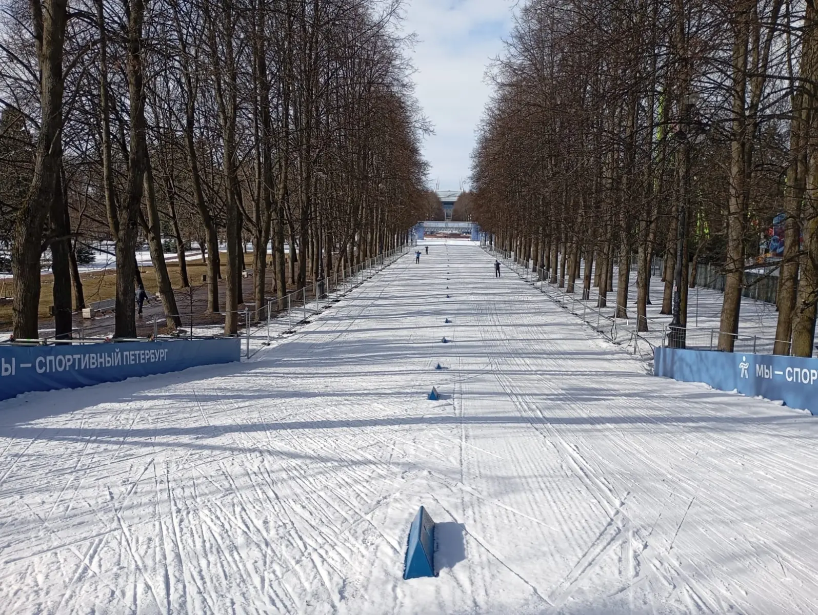 Бесплатная лыжная трасса организована в Приморском парке Победы на Крестовском острове на центральной аллее парка (Батарейная дорога).