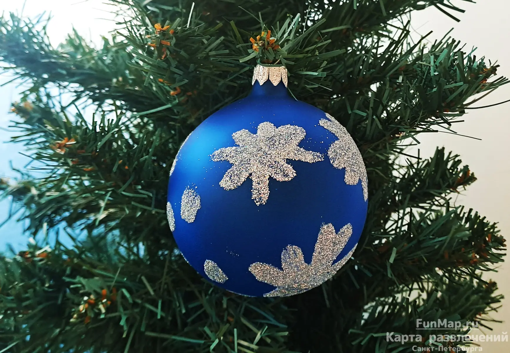 Участникам выдают по стеклянному однотонному шарику (у нас у всех был синий), а также кисточку, клей и серебристые блестки.