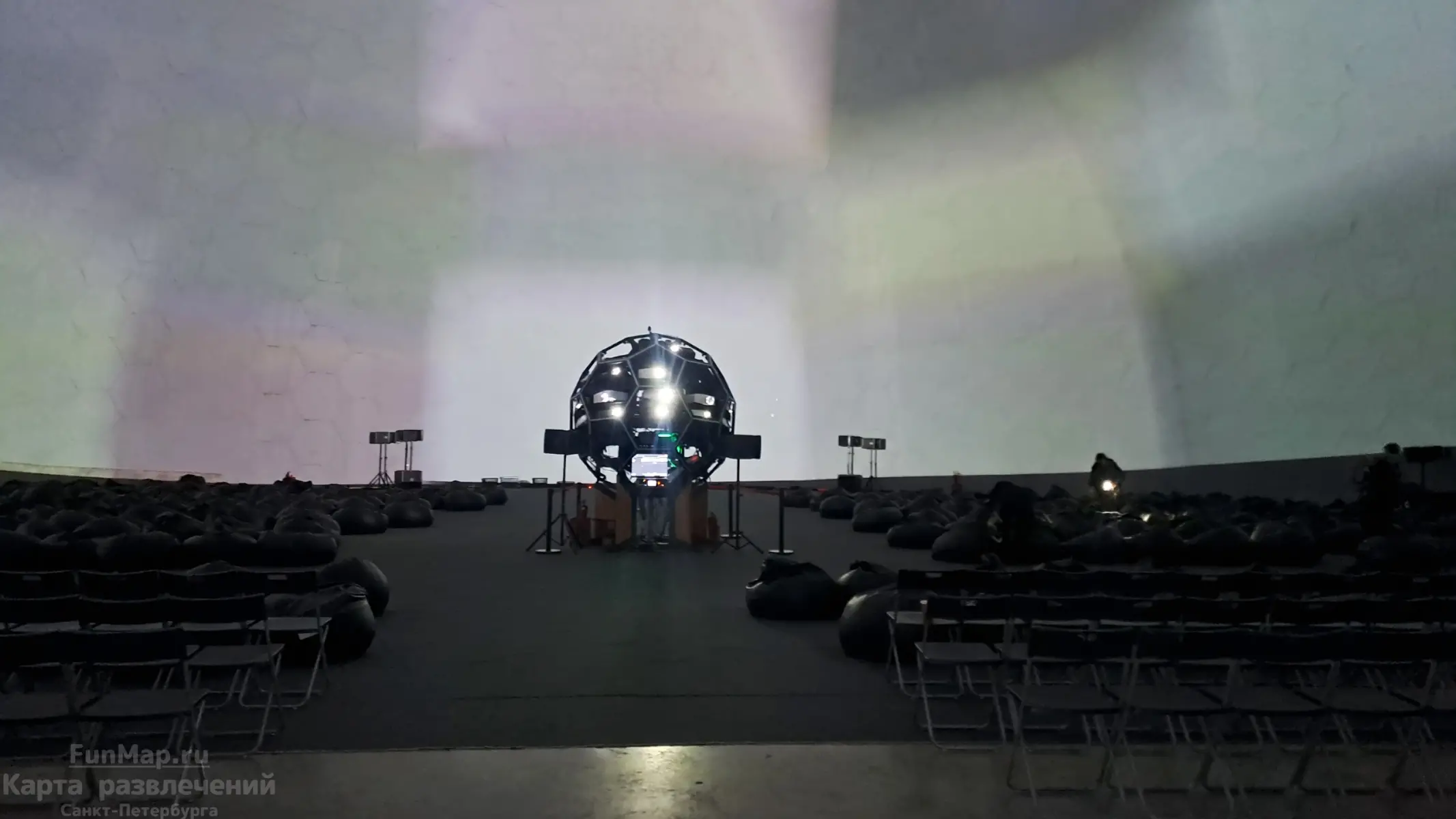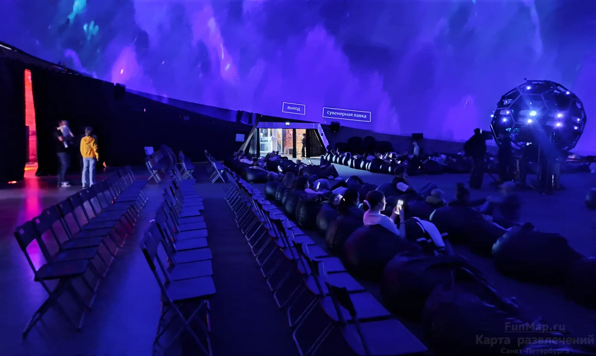 Рассадка в зале свободная - можно занять любое место. Удобно, что большинство мест это большие мягкие пуфики (кресла-мешки), на которых можно расположиться полулежа и с комфортом смотреть на купол над собой.