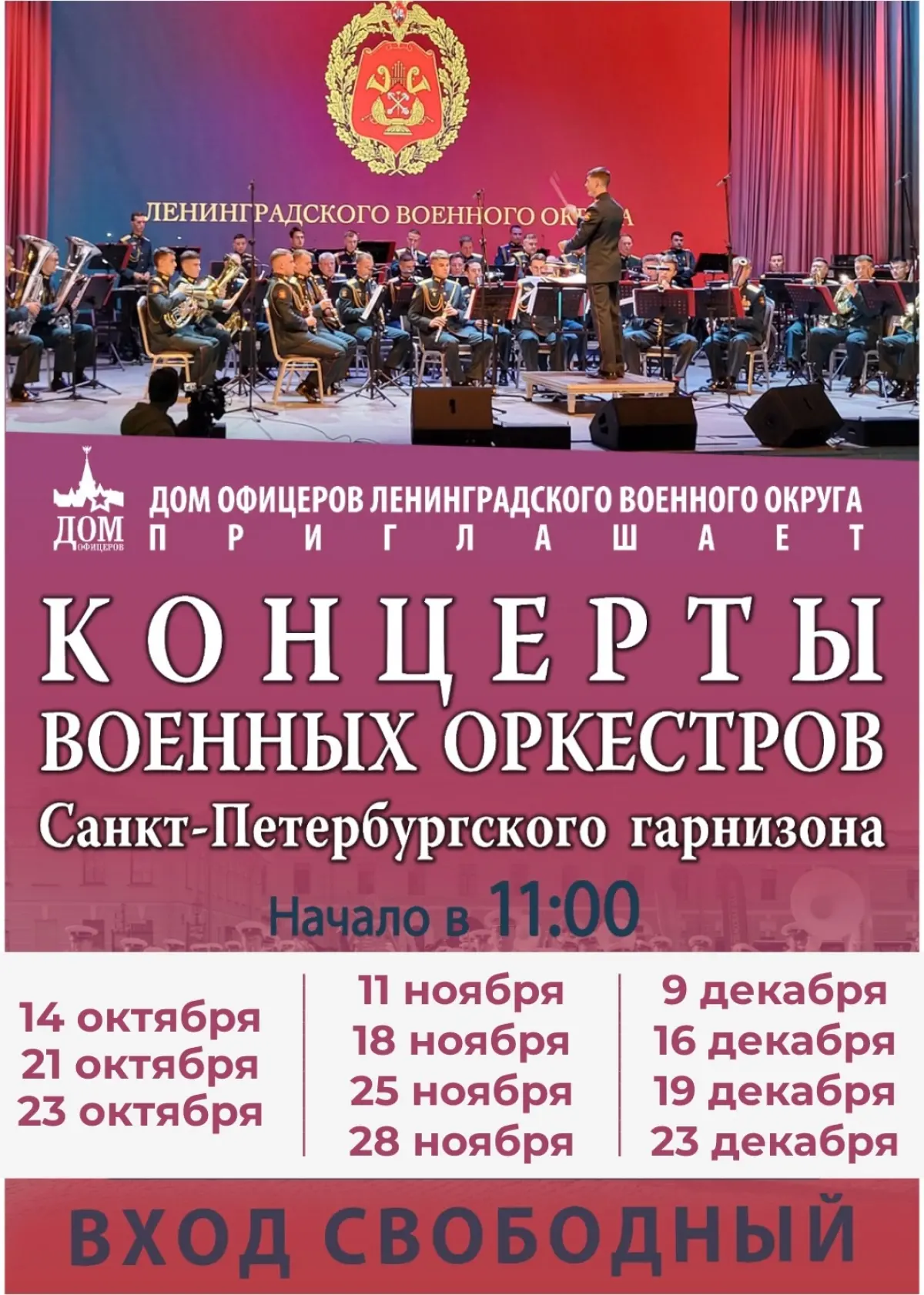 Дом офицеров Ленинградского военного округа приглашает сходить на бесплатные концерты военных оркестров.