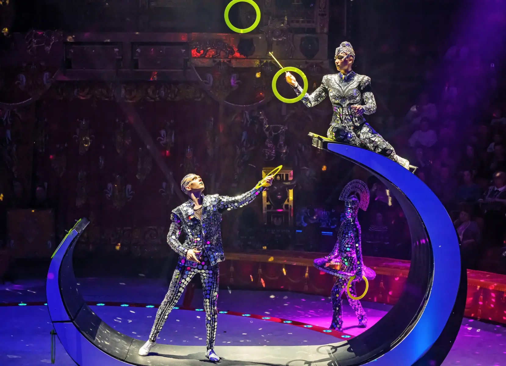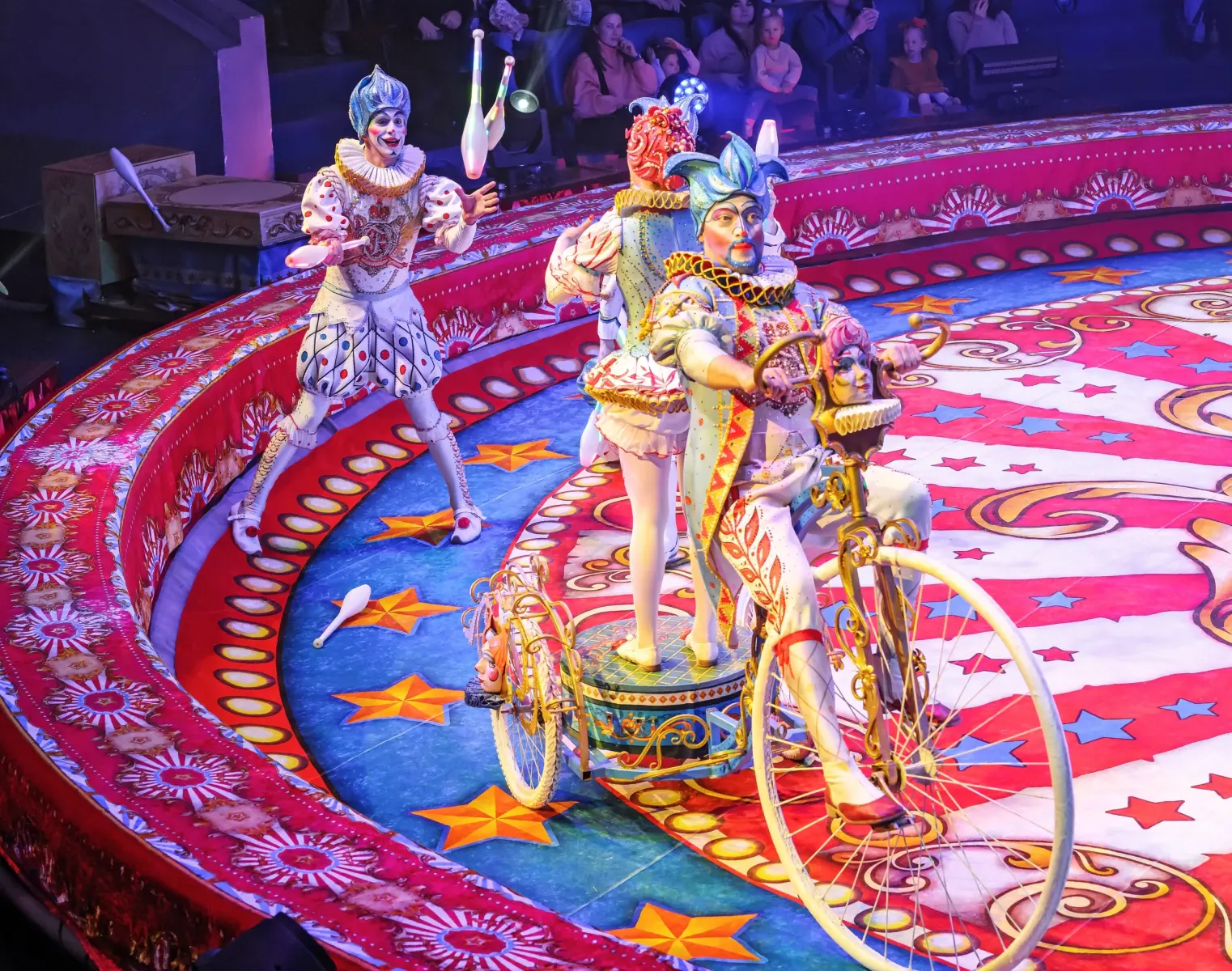 - Вращающийся манеж и настоящая карусель, вокруг которой ездят велосипеды, в то время как жонглеры одновременно кидают более семидесяти булав.