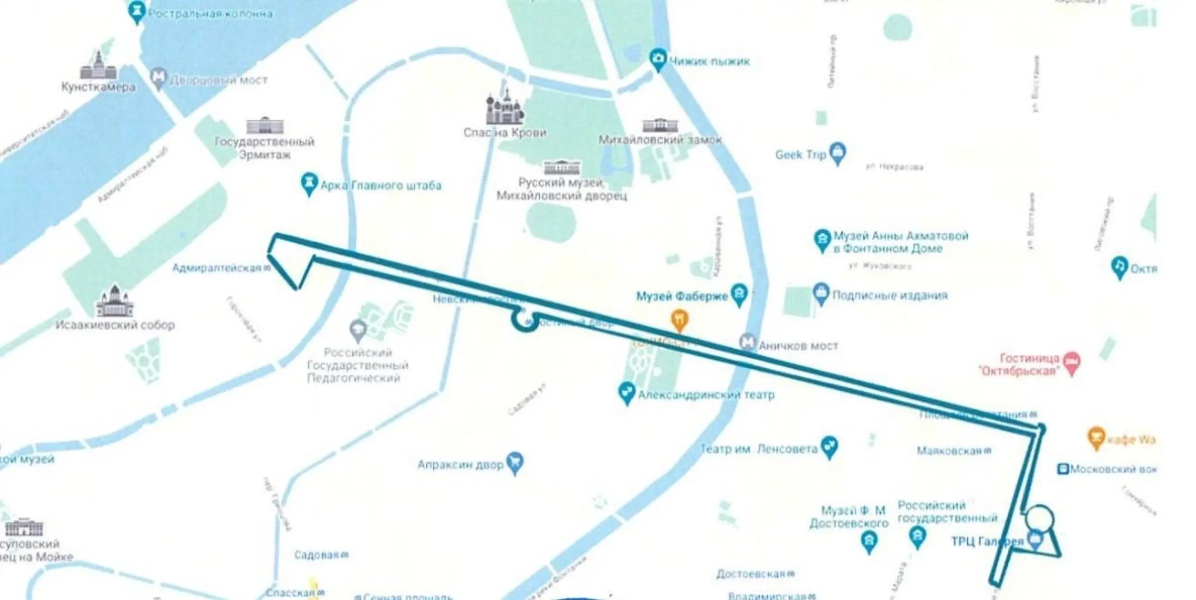 Маршрут автобуса с Дедами Морозами: новогодний автобус отправляется от ТРЦ «Галерея», по Невскому проспекту доезжает до метро Адмиралтейская и опять по Невскому едет до Лиговского проспекта.