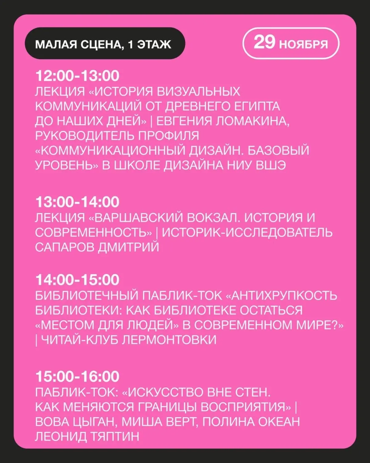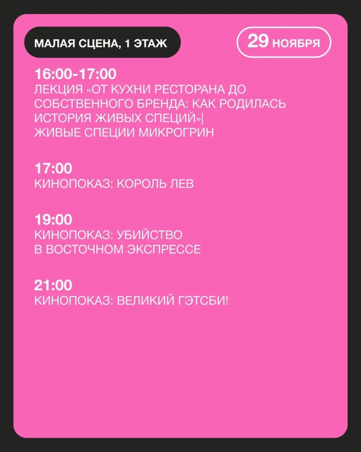 • Лекции и показы фильмов (Малая сцена, бесплатно).