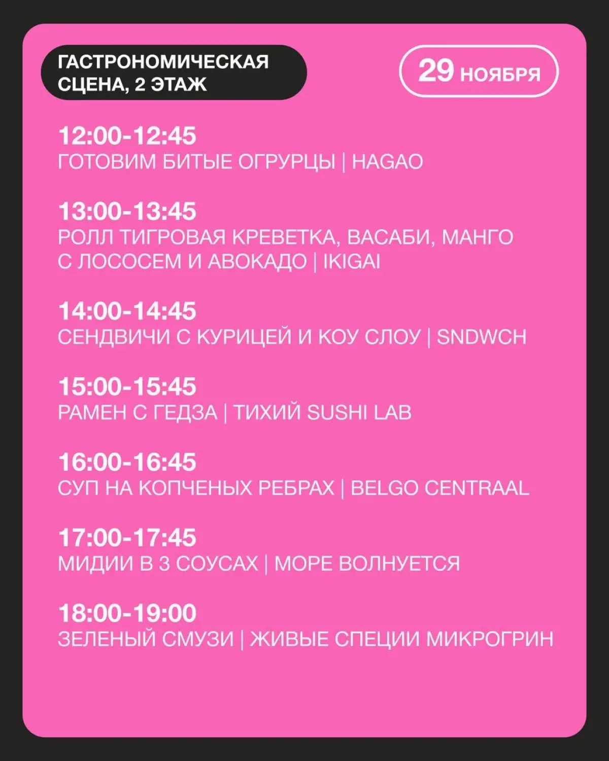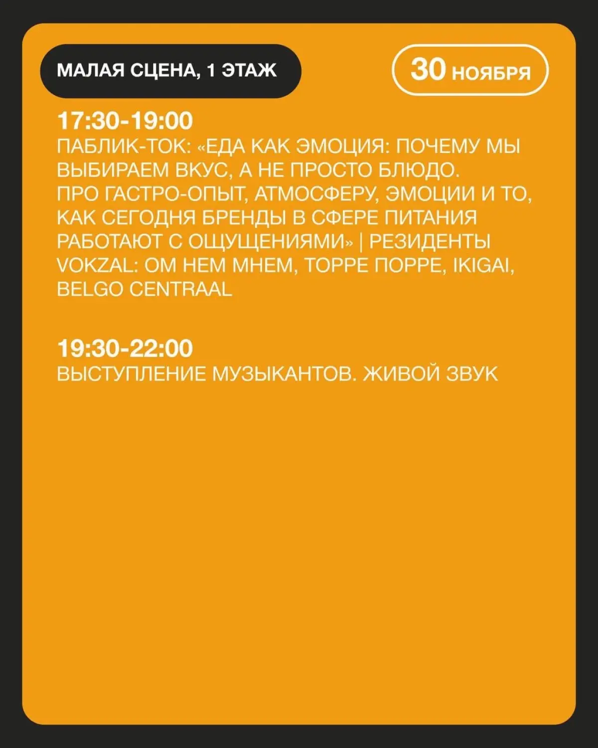 17:30-19:00 - Паблик-ток: "Еда как эмоция: почему мы выбираем вкус, а не просто блюдо.Про гастро-опыт, атмосферу, эмоции и то, как сегодня бренды в сфере питания работают с ощущениями"