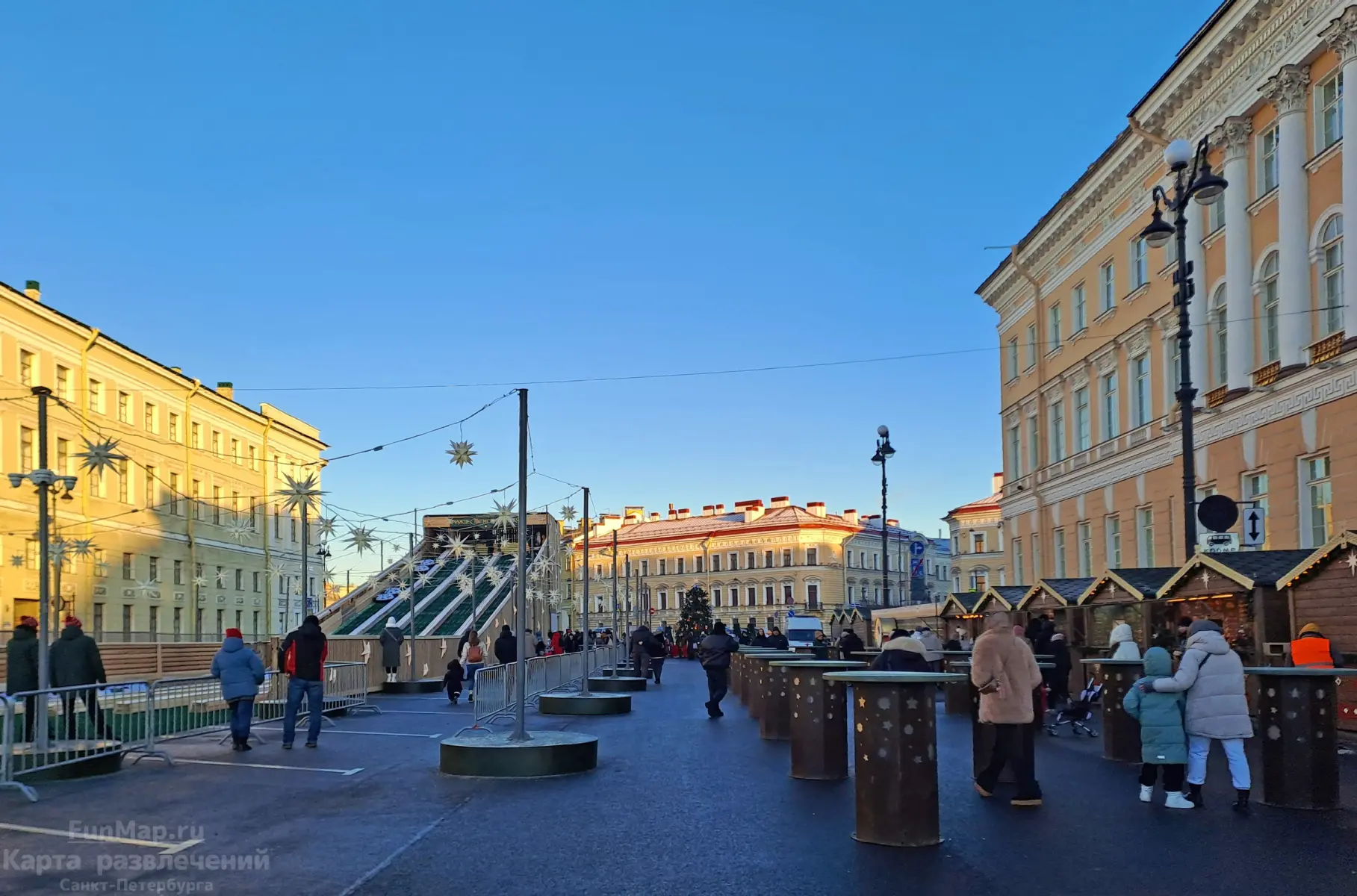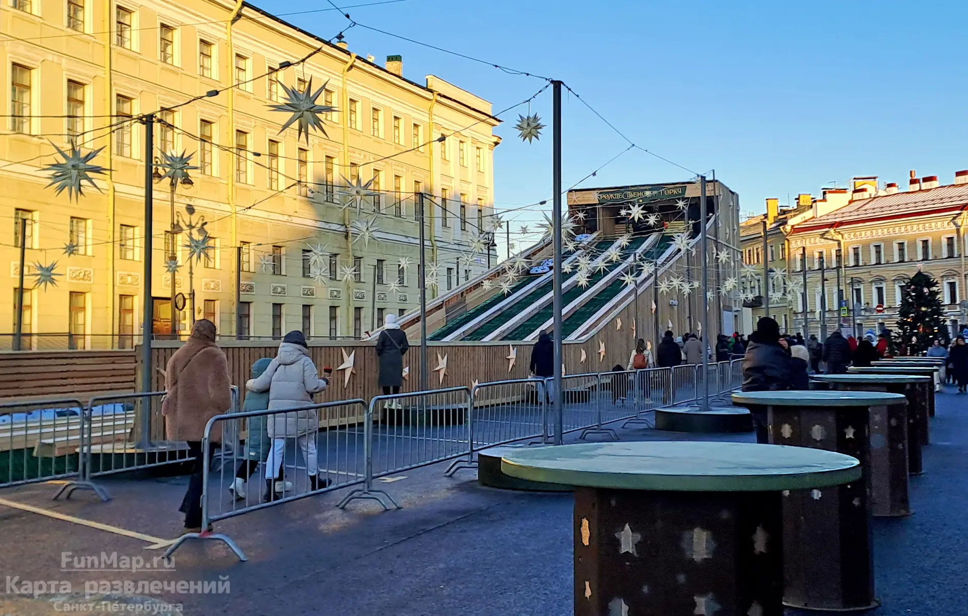 Горка находится не в центре Дворцовой площади, а ближе к Певческому мосту. Около горки расположено несколько лавочек с едой и сувенирами. Эта территория огорожена забором, вход через металлодетекторы и охрану.