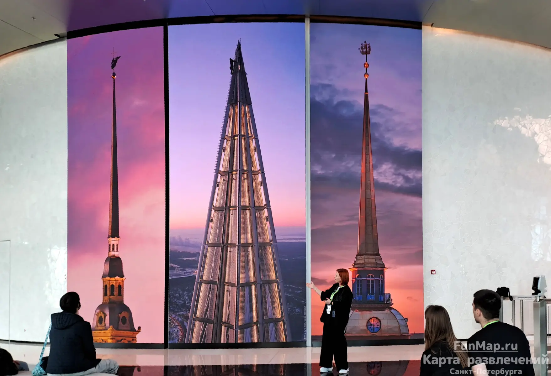 Гид рассказывала разные любопытные факты: про места, которые видно с башни, про то, как будет развиваться территория около Лахта Центра, какие трудности возникали при строительстве и эксплуатации башни и как их решали.