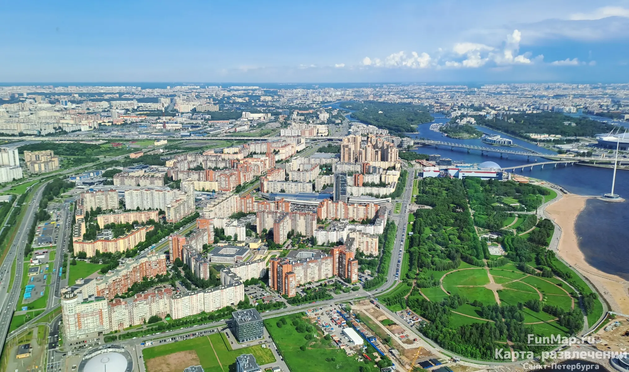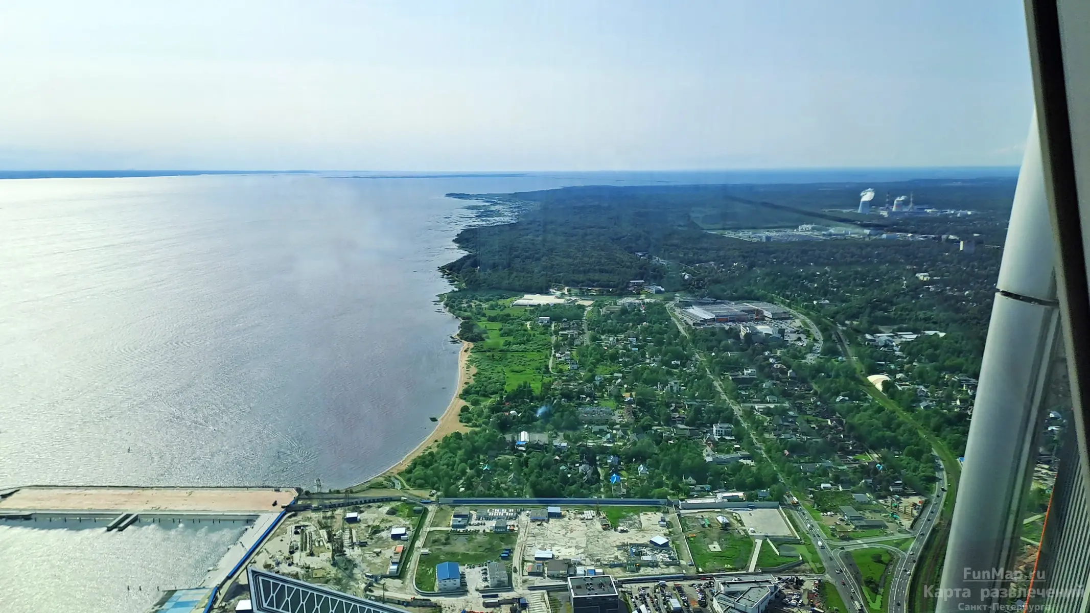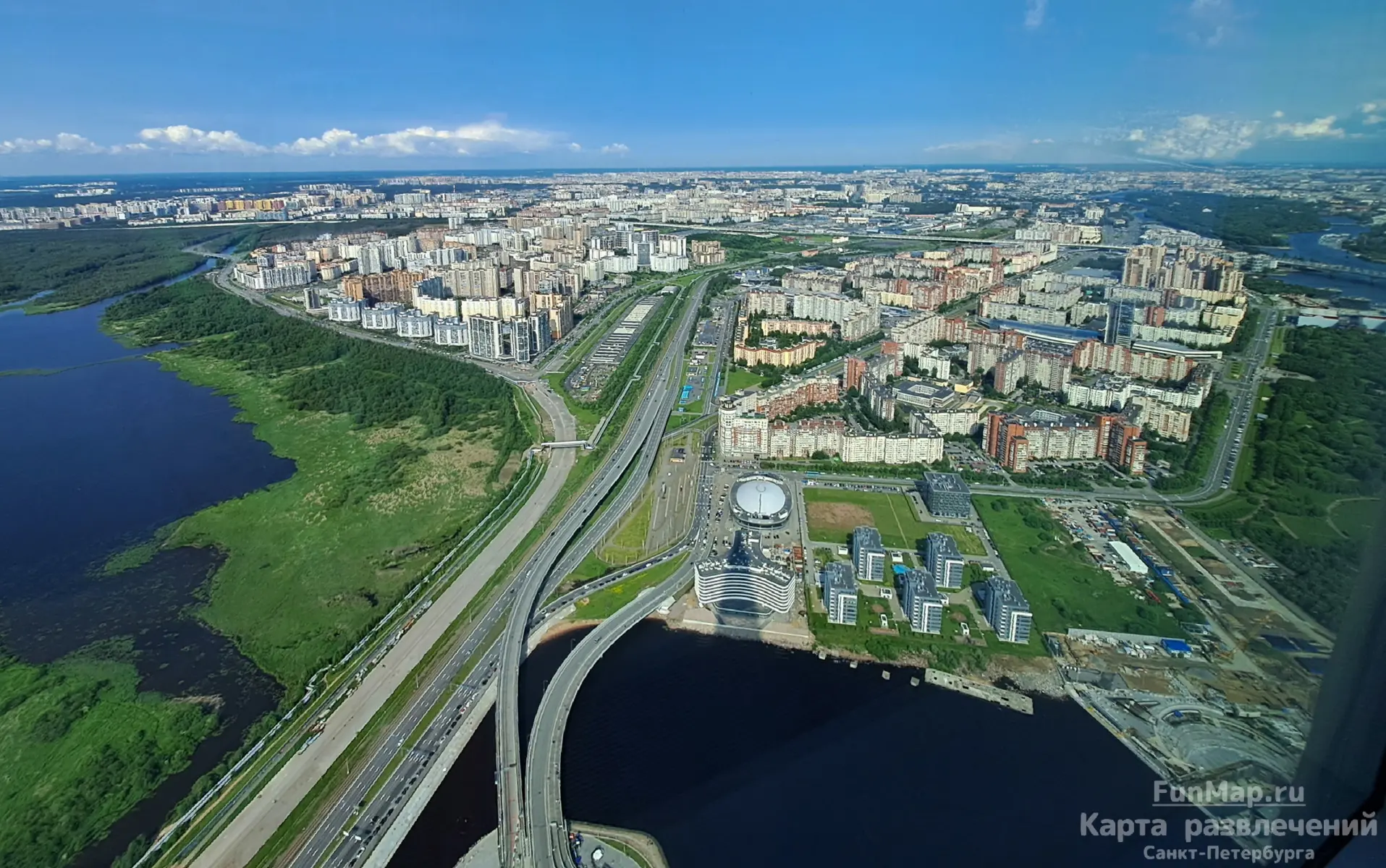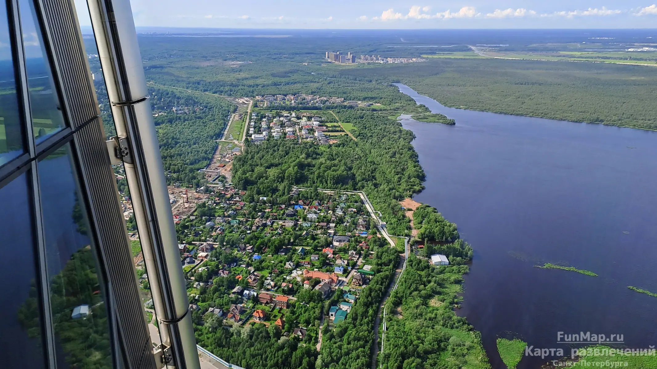 В сторону города, конечно, интереснее всего смотреть — хорошо виден Парк 300-летия Санкт-Петербурга с его огромными флагштоками, стадион «Зенит Арена», вантовые мосты, чуть дальше — Елагин и Крестовский острова. Ну и много-много разных домов.