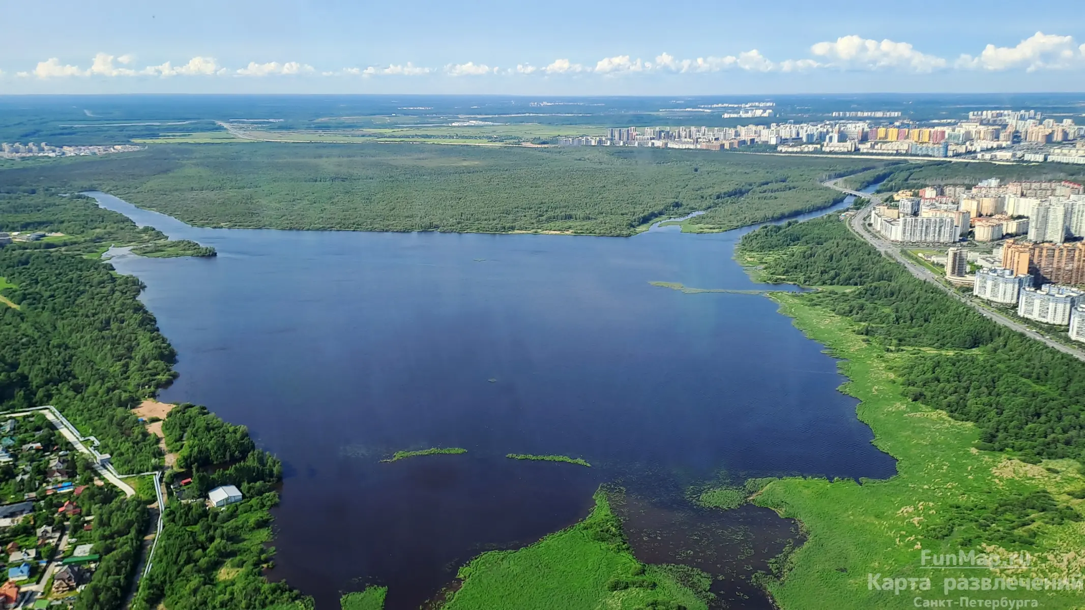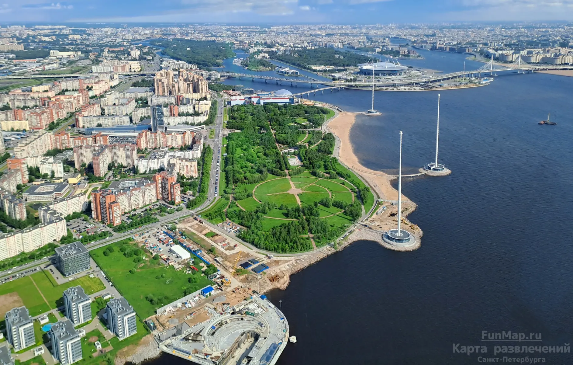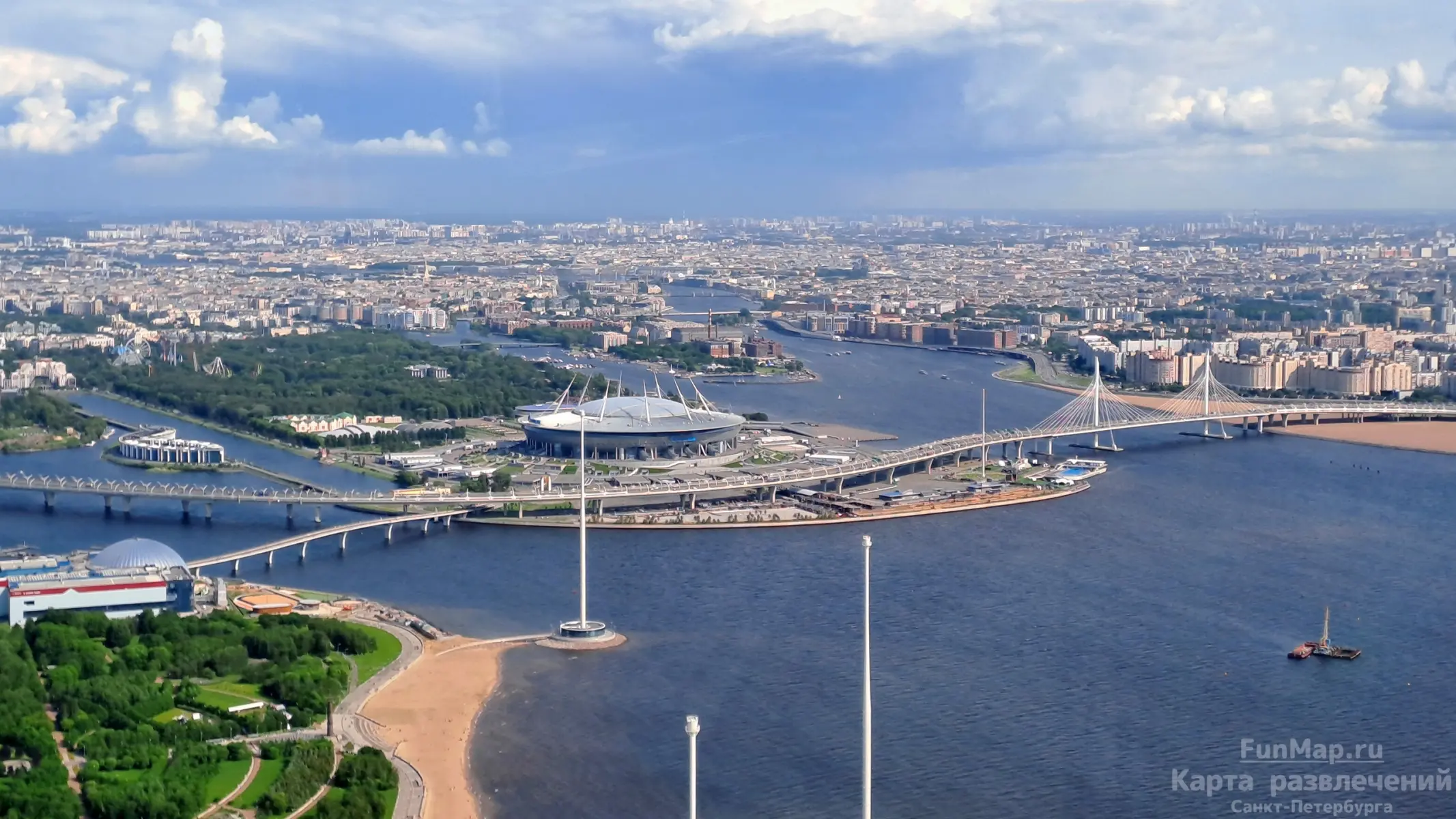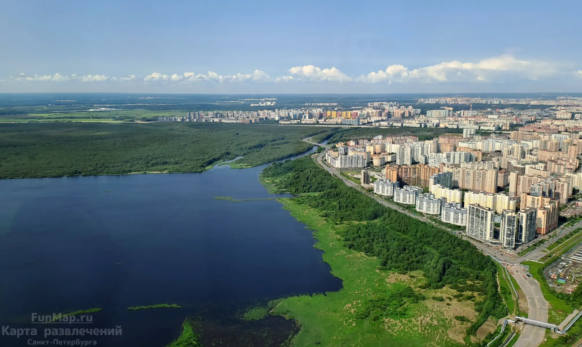 В сторону города, конечно, интереснее всего смотреть — хорошо виден Парк 300-летия Санкт-Петербурга с его огромными флагштоками, стадион «Зенит Арена», вантовые мосты, чуть дальше — Елагин и Крестовский острова. Ну и много-много разных домов.
