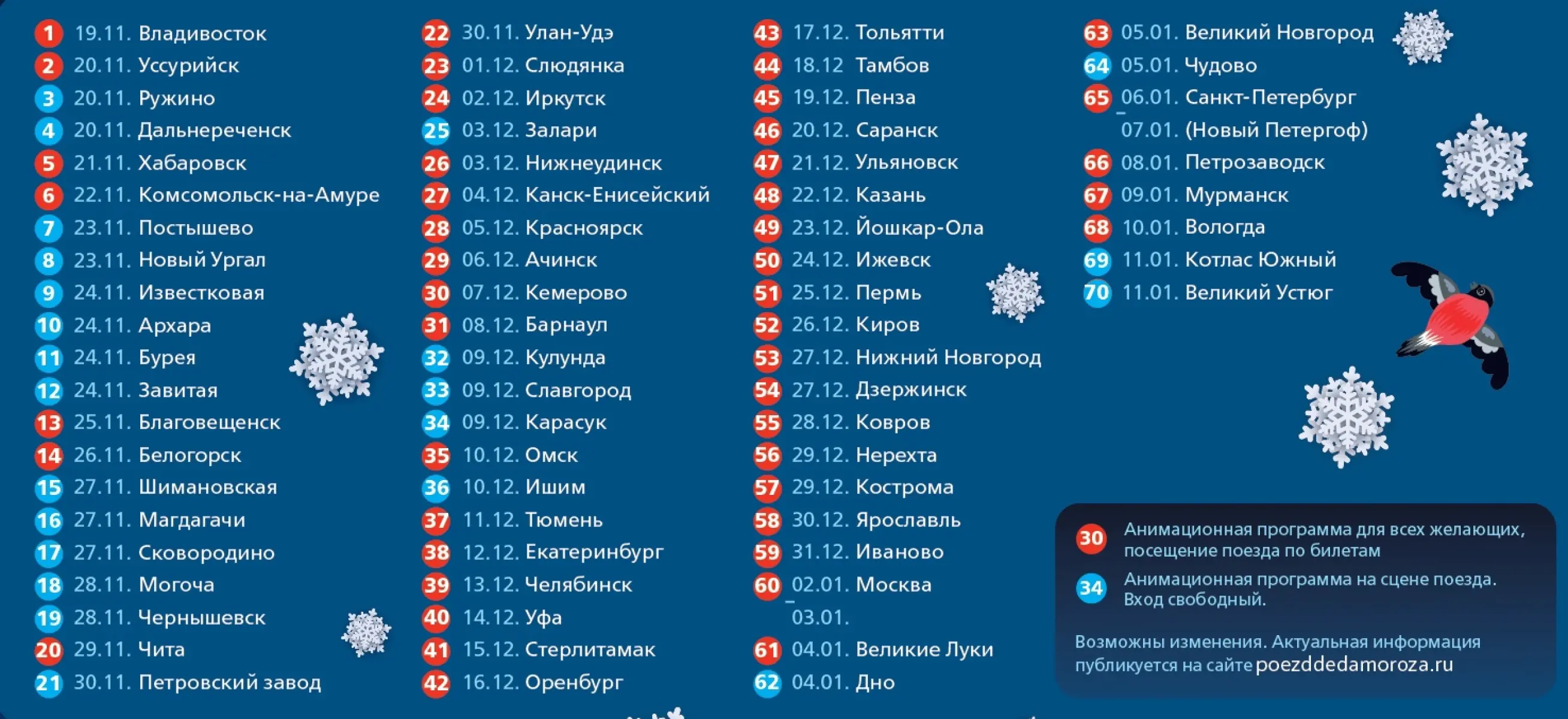 В 2025 году поезд отправляется 19 ноября из Владивостока, а 11 января 2026 года приедет в Великий Устюг. За время своего путешествия Дед Мороз посетит 70 городов, в которых поздравит детей с Новым годом!