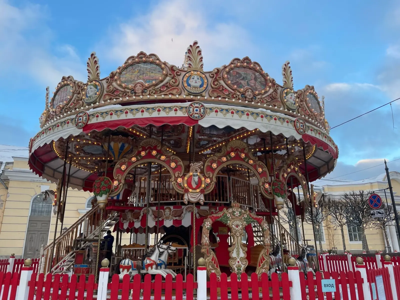 Большая красивая двухэтажная карусель высотой 12 метров!Карусель, как и каток, можно найти рядом с Манежной площадью на Кленовой улице.