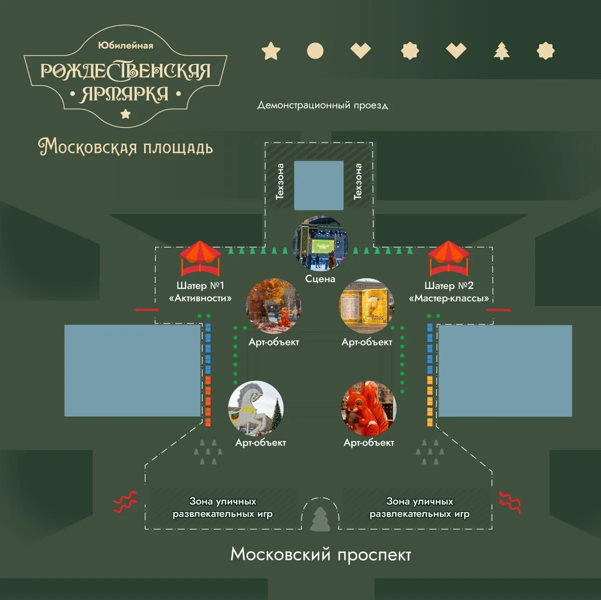 • Красивые арт-объекты, фотозоны и новогодняя елка.